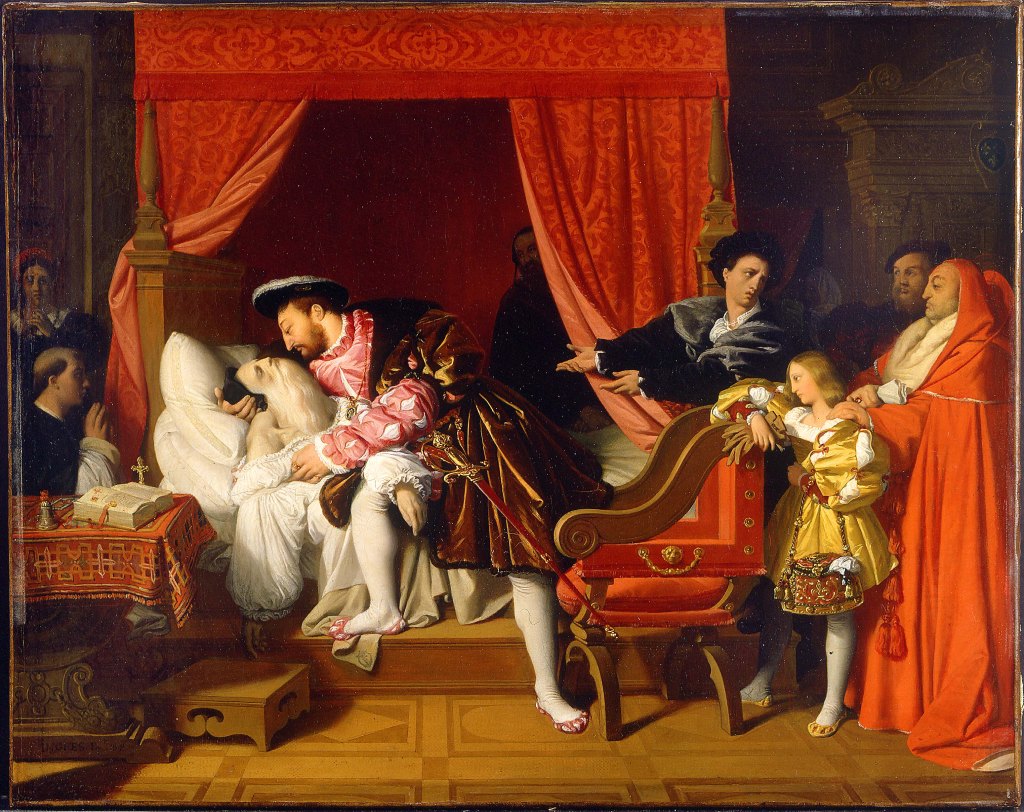 A painting by Jean-Auguste-Dominique Ingres (1818) imagining a possibly fictitious event where King François I of France was present at the deathbed of Leonardo da Vinci. At the very least, da Vinci was just one of a large number of Italian luminaries that François I sponsored and befriended. Source: Petit Palais, Paris. A portrait of Diane de Poitiers by François Clouet. Date unknown. Source: Palais de Versailles. A portrait of Henri II from the workshop of François Clouet (c. 1560). Note that Henri is wearing black and white, like Diane de Poitiers. Source: Musée Condé, Chantilly.