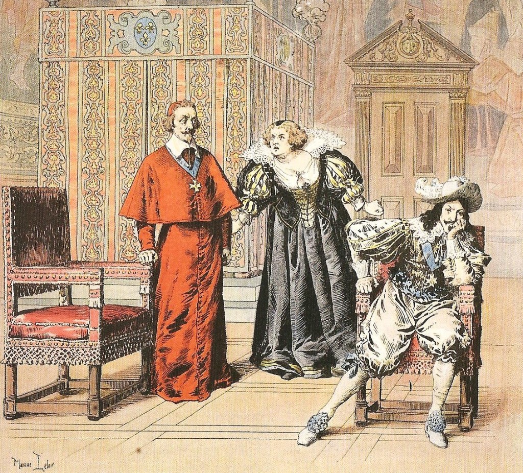 The artist Maurice Leloir’s portrayal of the Day of the Dupes, specifically the Cardinal du Richelieu walking in on Marie de’ Medici and Louis XIII’s argument about him, for the 1901 biography of Richelieu written by Théodore Cahu.