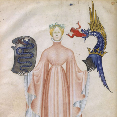 A miniature depicting Valentina Visconti, Duchesse d’Orléans, with the symbols of Milan and the Visconti family, from a copy of Cicero’s De natura deorum, c. 1400. Source: anne-marie.eu.
